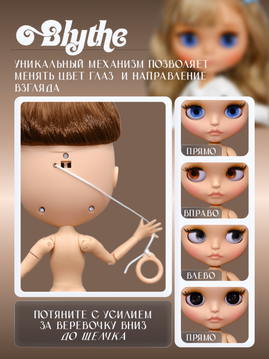 глазной механизм: 4 цвета глаз, смена цвета и направления взгляда с помощью верёвочки на затылке.