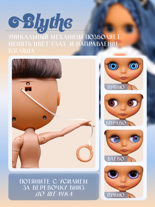 глазной механизм: 4 цвета глаз, смена цвета и направления взгляда с помощью верёвочки на затылке.
