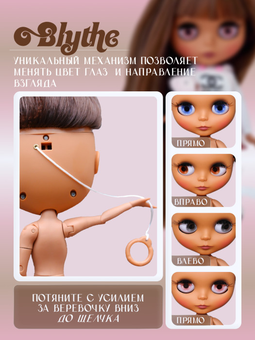 глазной механизм: 4 цвета глаз, смена цвета и направления взгляда с помощью верёвочки на затылке.