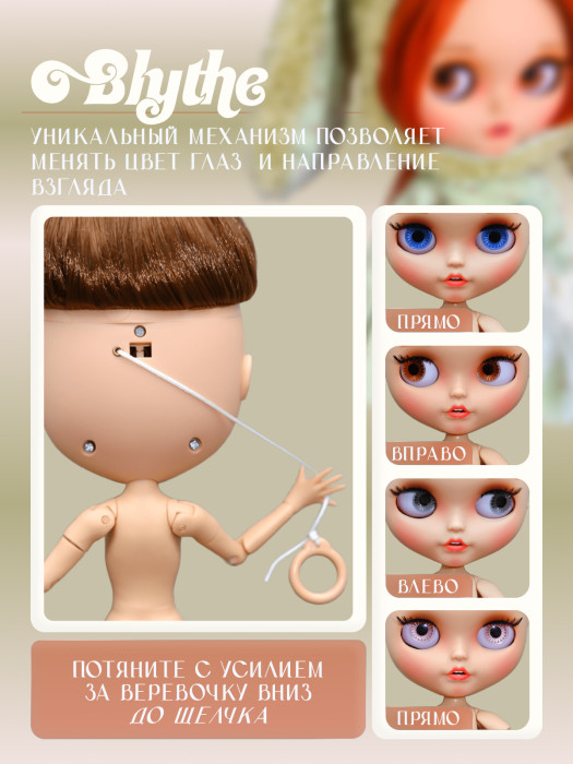глазной механизм: 4 цвета глаз, смена цвета и направления взгляда с помощью верёвочки на затылке.