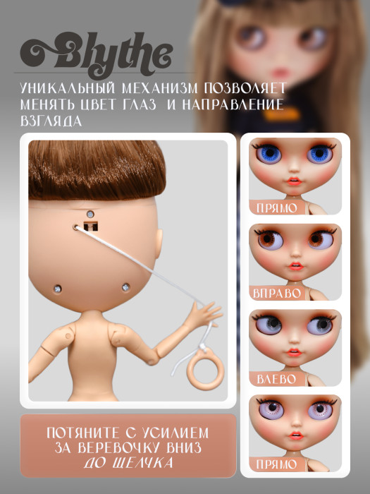 глазной механизм: 4 цвета глаз, смена цвета и направления взгляда с помощью верёвочки на затылке.