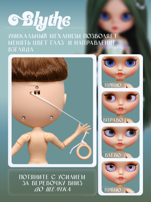 глазной механизм: 4 цвета глаз, смена цвета и направления взгляда с помощью верёвочки на затылке.