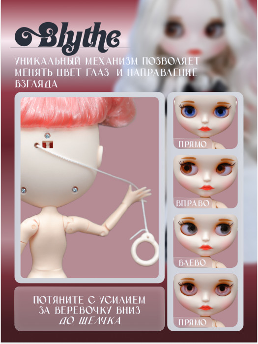 глазной механизм: 4 цвета глаз, смена цвета и направления взгляда с помощью верёвочки на затылке.