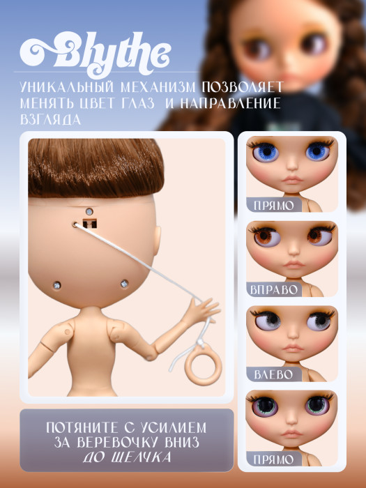 глазной механизм: 4 цвета глаз, смена цвета и направления взгляда с помощью верёвочки на затылке.