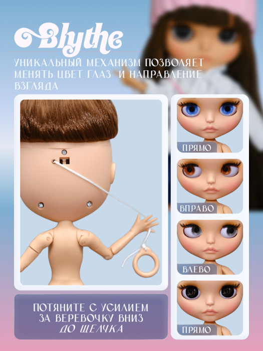 глазной механизм: 4 цвета глаз, смена цвета и направления взгляда с помощью верёвочки на затылке.