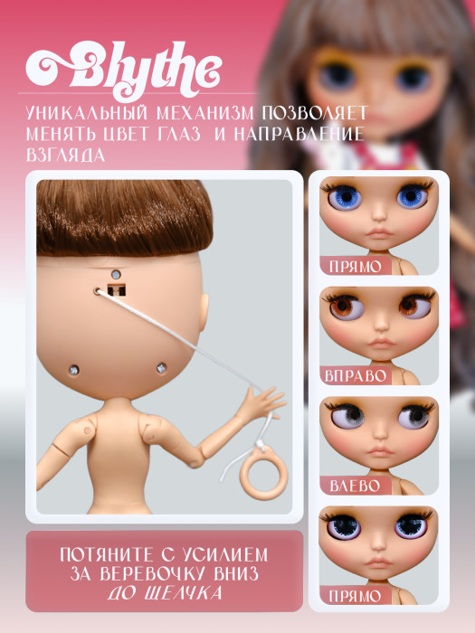 глазной механизм: 4 цвета глаз, смена цвета и направления взгляда с помощью верёвочки на затылке.