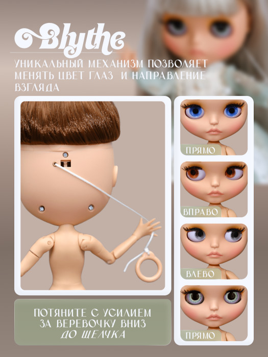 глазной механизм: 4 цвета глаз, смена цвета и направления взгляда с помощью верёвочки на затылке.