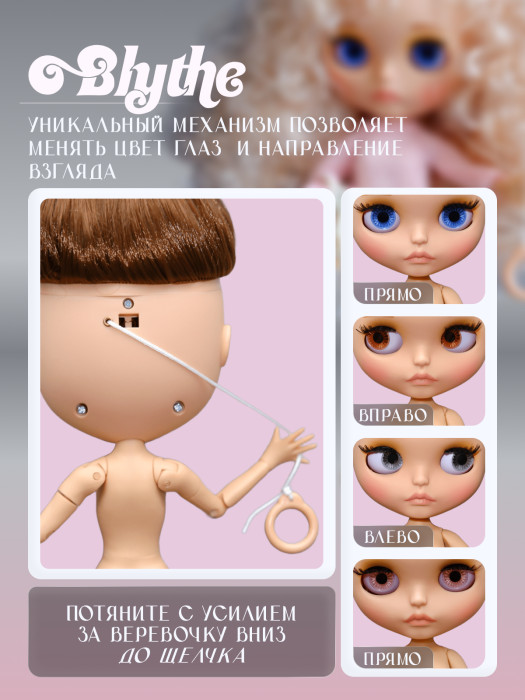 глазной механизм: 4 цвета глаз, смена цвета и направления взгляда с помощью верёвочки на затылке.