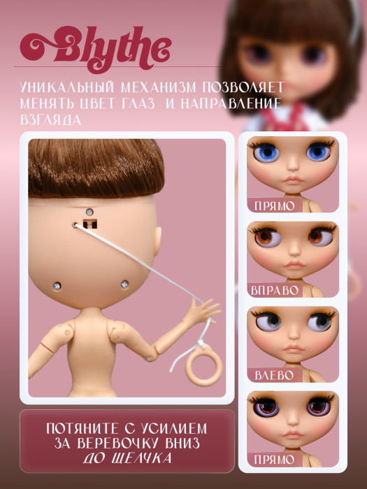 глазной механизм: 4 цвета глаз, смена цвета и направления взгляда с помощью верёвочки на затылке.