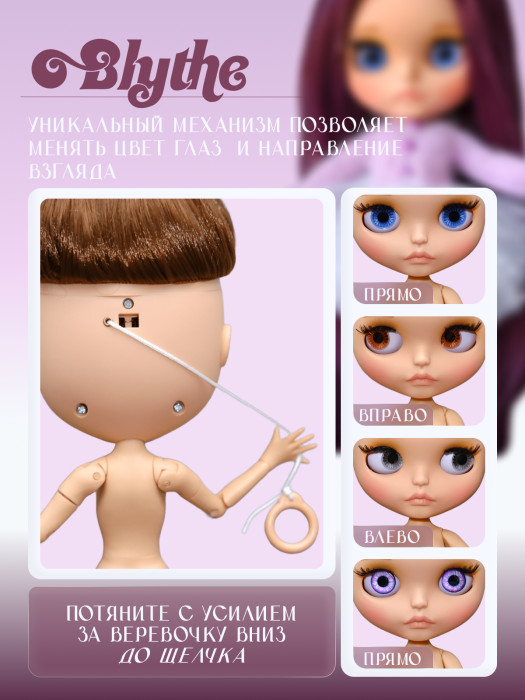 глазной механизм: 4 цвета глаз, смена цвета и направления взгляда с помощью верёвочки на затылке.
