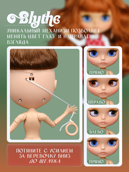 глазной механизм: 4 цвета глаз, смена цвета и направления взгляда с помощью верёвочки на затылке.