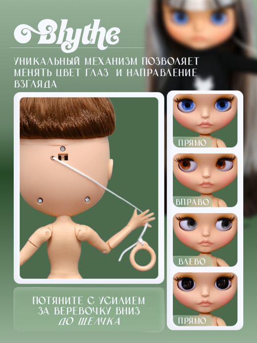 глазной механизм: 4 цвета глаз, смена цвета и направления взгляда с помощью верёвочки на затылке.