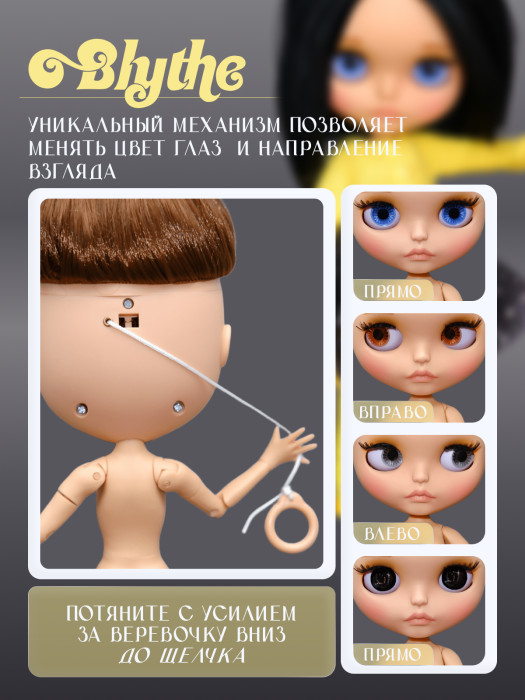 глазной механизм: 4 цвета глаз, смена цвета и направления взгляда с помощью верёвочки на затылке.