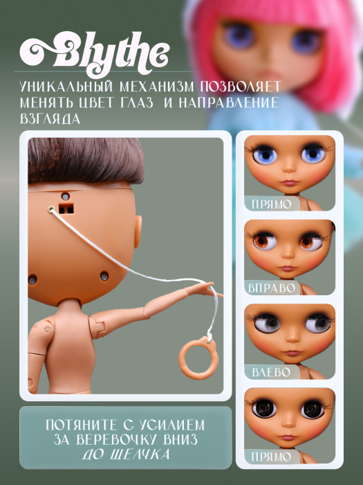 глазной механизм: 4 цвета глаз, смена цвета и направления взгляда с помощью верёвочки на затылке.
