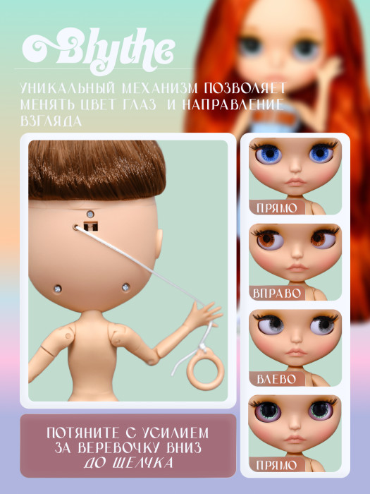 глазной механизм: 4 цвета глаз, смена цвета и направления взгляда с помощью верёвочки на затылке.