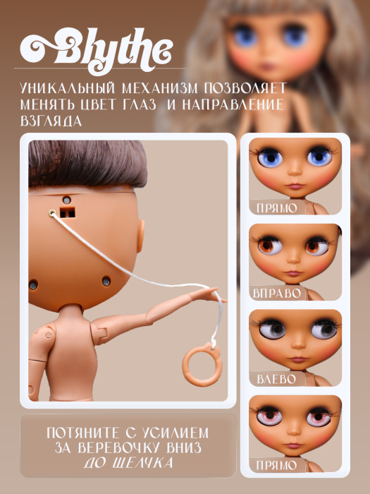 глазной механизм: 4 цвета глаз, смена цвета и направления взгляда с помощью верёвочки на затылке.