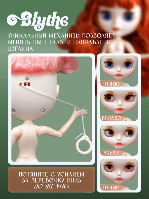 глазной механизм: 4 цвета глаз, смена цвета и направления взгляда с помощью верёвочки на затылке.