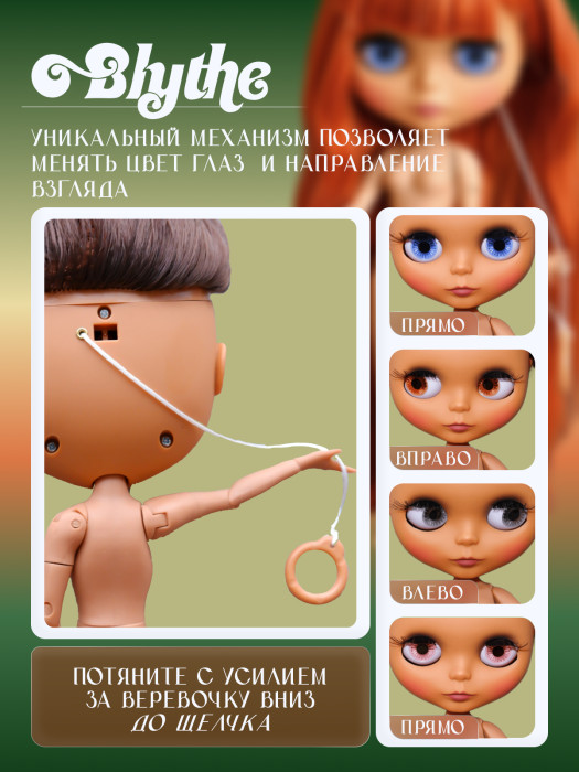 глазной механизм: 4 цвета глаз, смена цвета и направления взгляда с помощью верёвочки на затылке.