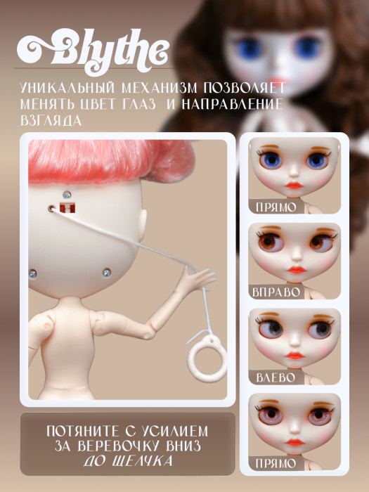 глазной механизм: 4 цвета глаз, смена цвета и направления взгляда с помощью верёвочки на затылке.