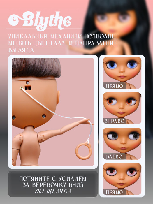 глазной механизм: 4 цвета глаз, смена цвета и направления взгляда с помощью верёвочки на затылке.