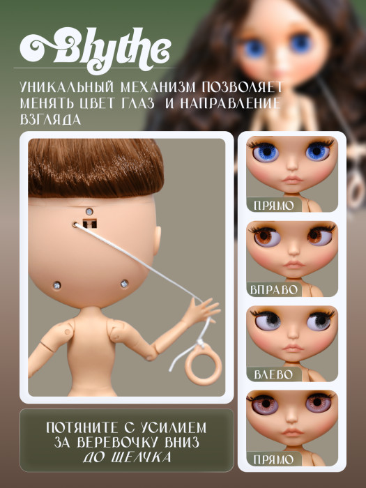 глазной механизм: 4 цвета глаз, смена цвета и направления взгляда с помощью верёвочки на затылке.