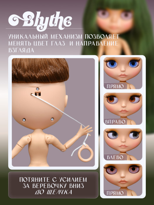 глазной механизм: 4 цвета глаз, смена цвета и направления взгляда с помощью верёвочки на затылке.