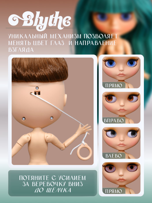 глазной механизм: 4 цвета глаз, смена цвета и направления взгляда с помощью верёвочки на затылке.
