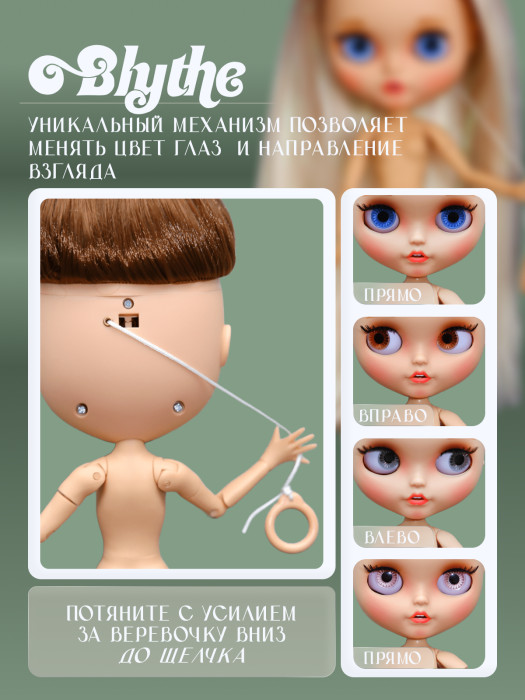 глазной механизм: 4 цвета глаз, смена цвета и направления взгляда с помощью верёвочки на затылке.