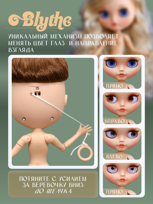 глазной механизм: 4 цвета глаз, смена цвета и направления взгляда с помощью верёвочки на затылке.