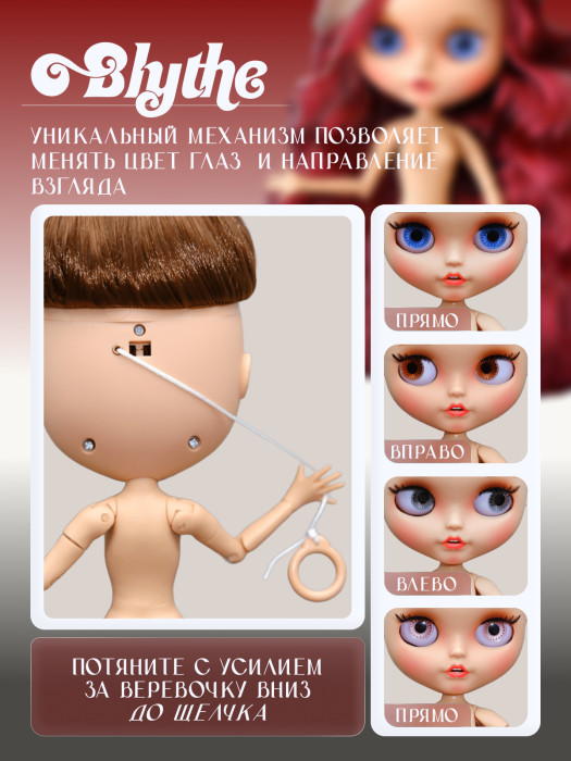 глазной механизм: 4 цвета глаз, смена цвета и направления взгляда с помощью верёвочки на затылке.
