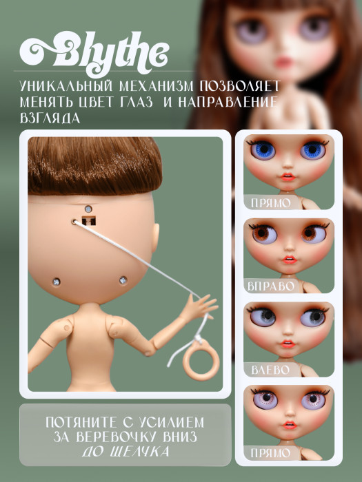 глазной механизм: 4 цвета глаз, смена цвета и направления взгляда с помощью верёвочки на затылке.