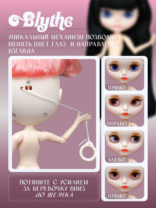 глазной механизм: 4 цвета глаз, смена цвета и направления взгляда с помощью верёвочки на затылке.
