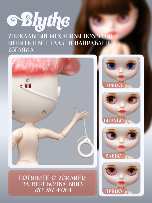 глазной механизм: 4 цвета глаз, смена цвета и направления взгляда с помощью верёвочки на затылке.