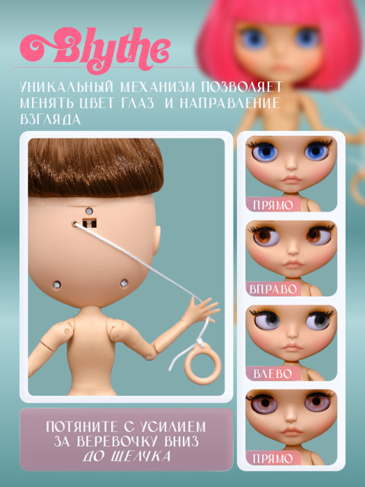 глазной механизм: 4 цвета глаз, смена цвета и направления взгляда с помощью верёвочки на затылке.