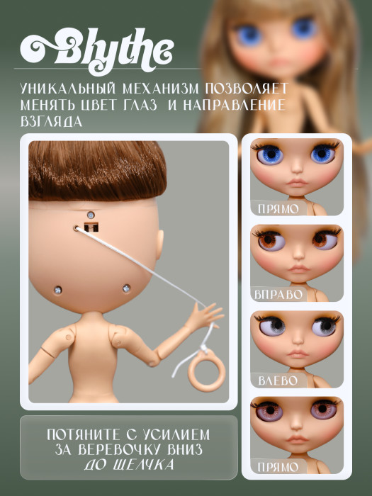 глазной механизм: 4 цвета глаз, смена цвета и направления взгляда с помощью верёвочки на затылке.