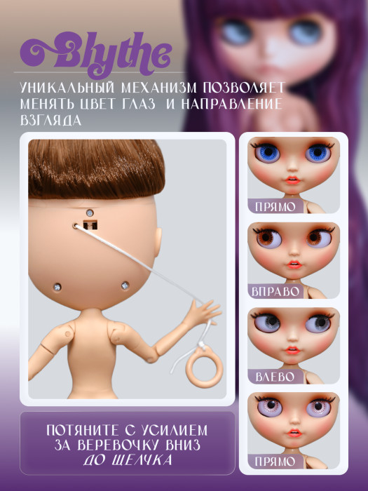 глазной механизм: 4 цвета глаз, смена цвета и направления взгляда с помощью верёвочки на затылке.