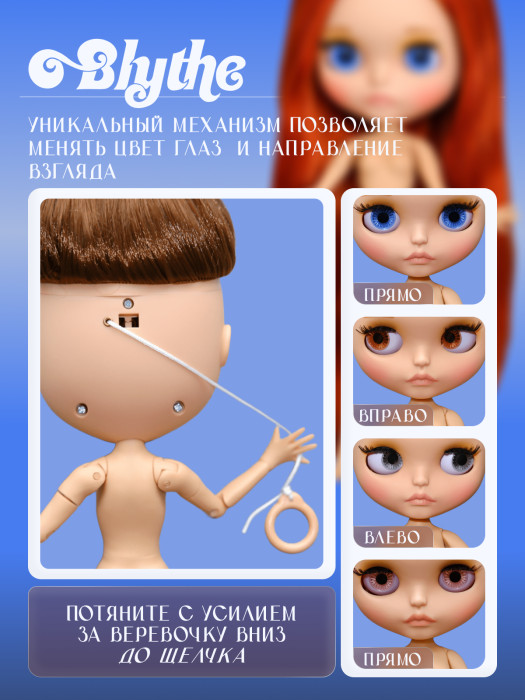 глазной механизм: 4 цвета глаз, смена цвета и направления взгляда с помощью верёвочки на затылке.