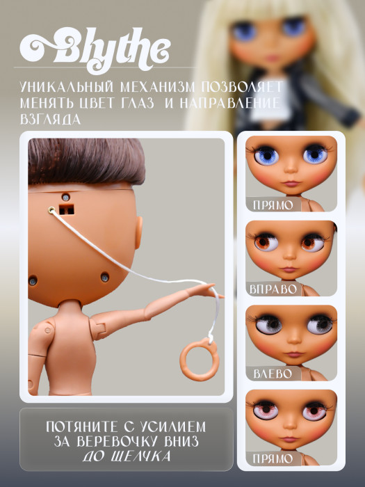 глазной механизм: 4 цвета глаз, смена цвета и направления взгляда с помощью верёвочки на затылке.