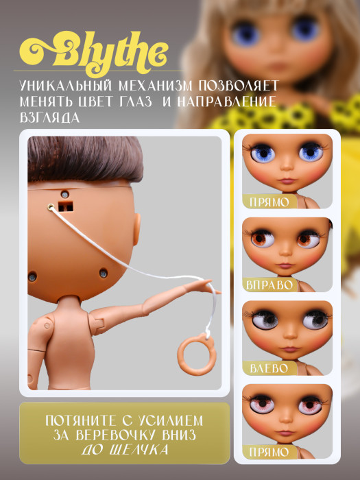 глазной механизм: 4 цвета глаз, смена цвета и направления взгляда с помощью верёвочки на затылке.