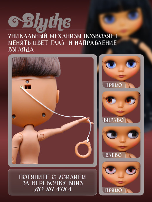 глазной механизм: 4 цвета глаз, смена цвета и направления взгляда с помощью верёвочки на затылке.