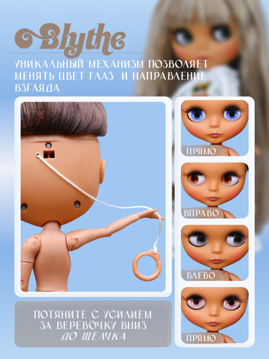 глазной механизм: 4 цвета глаз, смена цвета и направления взгляда с помощью верёвочки на затылке.