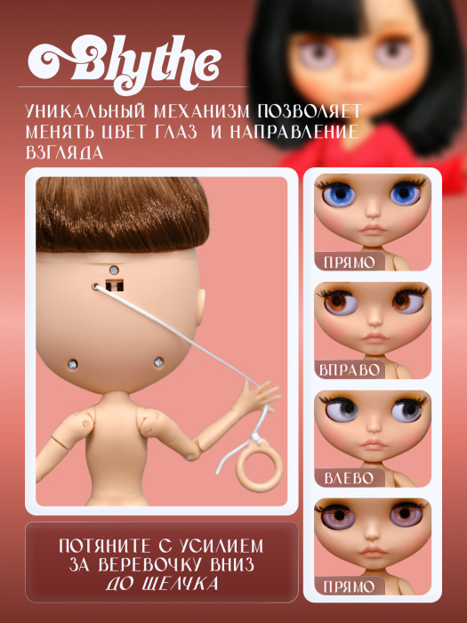 глазной механизм: 4 цвета глаз, смена цвета и направления взгляда с помощью верёвочки на затылке.
