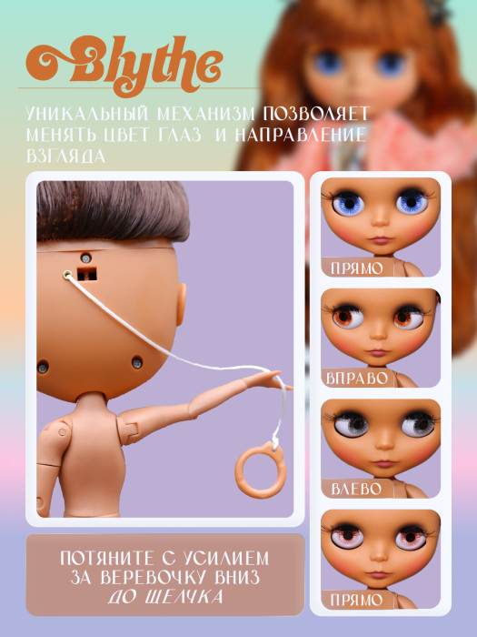 глазной механизм: 4 цвета глаз, смена цвета и направления взгляда с помощью верёвочки на затылке.