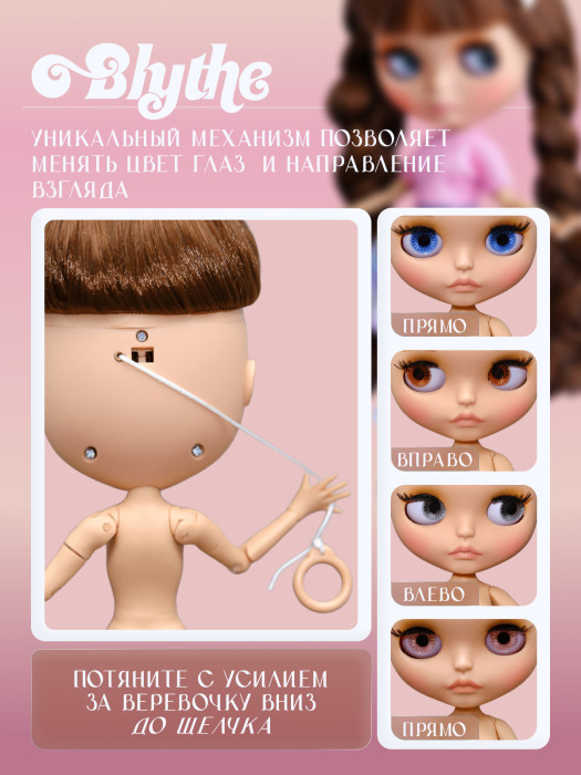 глазной механизм: 4 цвета глаз, смена цвета и направления взгляда с помощью верёвочки на затылке.