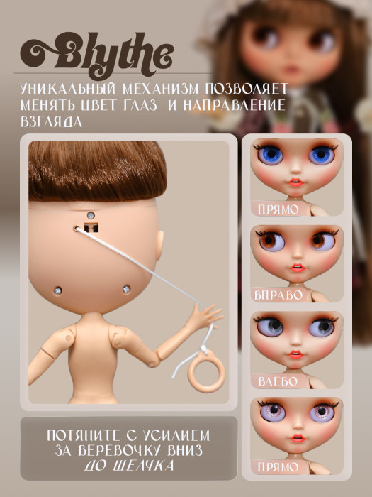 глазной механизм: 4 цвета глаз, смена цвета и направления взгляда с помощью верёвочки на затылке.