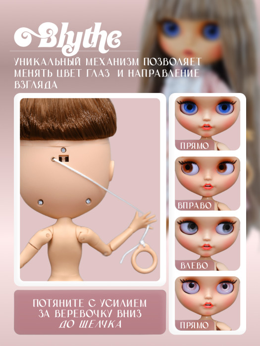 глазной механизм: 4 цвета глаз, смена цвета и направления взгляда с помощью верёвочки на затылке.