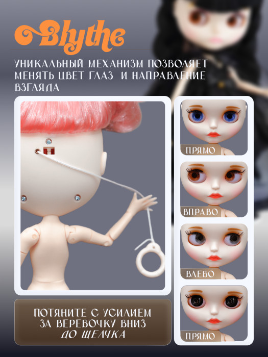 глазной механизм: 4 цвета глаз, смена цвета и направления взгляда с помощью верёвочки на затылке.