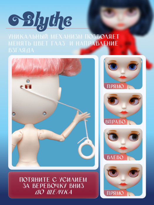глазной механизм: 4 цвета глаз, смена цвета и направления взгляда с помощью верёвочки на затылке.