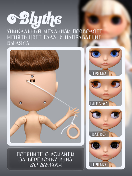 глазной механизм: 4 цвета глаз, смена цвета и направления взгляда с помощью верёвочки на затылке.