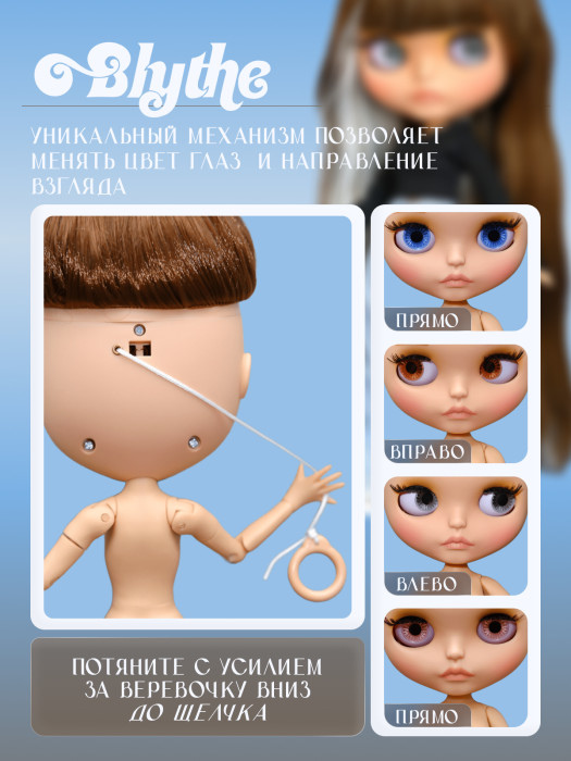 глазной механизм: 4 цвета глаз, смена цвета и направления взгляда с помощью верёвочки на затылке.